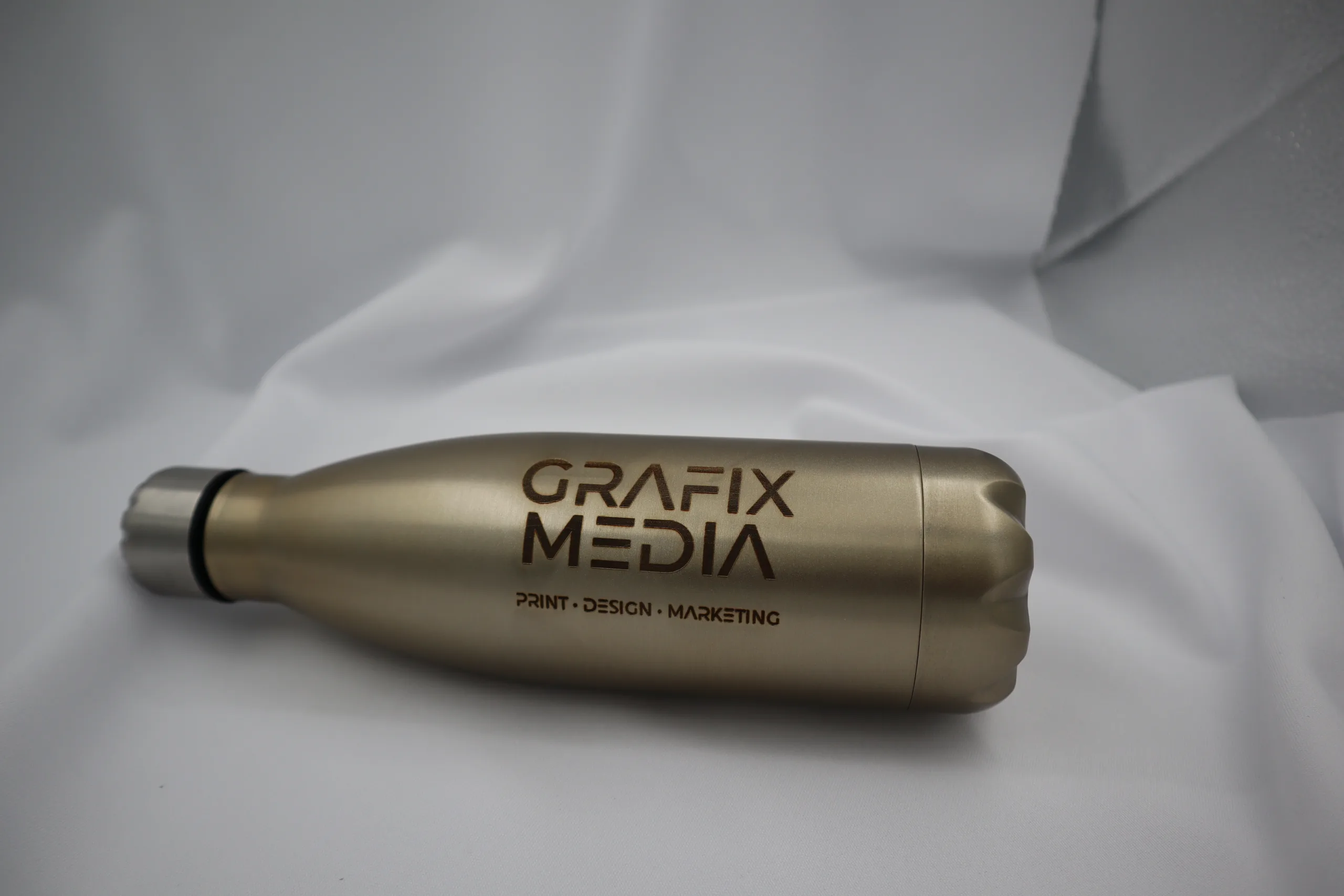 At Grafix Media in Calgary, we provide laser engraved drinkware for business, events, gifting and personal use. Our laser systems create permanent marks that do not fade, peel, or wear off. Each item is engraved with precision for clean, consistent results. Laser engraving removes only the surface coating of the drinkware. This process produces a sharp, high-contrast mark without affecting the strength or function of the item. The engraving stays clear through daily use and repeated washing. We engrave single items and bulk orders. Artwork is reviewed before production to confirm placement and clarity. All engraving and quality control is handled in-house by us.